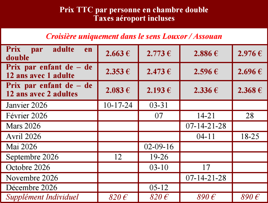 Nos prix ont été établis en fonction des tarifs connus au 1er février 2024. Ils sont susceptibles de modifications en fonction de toute variation de nos prix d’achats aériens et terrestres. En cas d’augmentation des taxes, du carburant, des frais de visa, des tickets d’entrée, des produits de première nécessité, des salaires, une nouvelle dévaluation de la monnaie égyptienne… une révision de 4 à 6 % peut être appliquée. Cet ajustement tarifaire ne peut en aucun cas dépasser 6% du montant total de la facture.