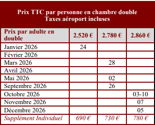 • Les taxes aéroport connues à ce jour : 342 € par personne (susceptibles d’augmentation sans préavis – montant définitif à l’émission des billets).